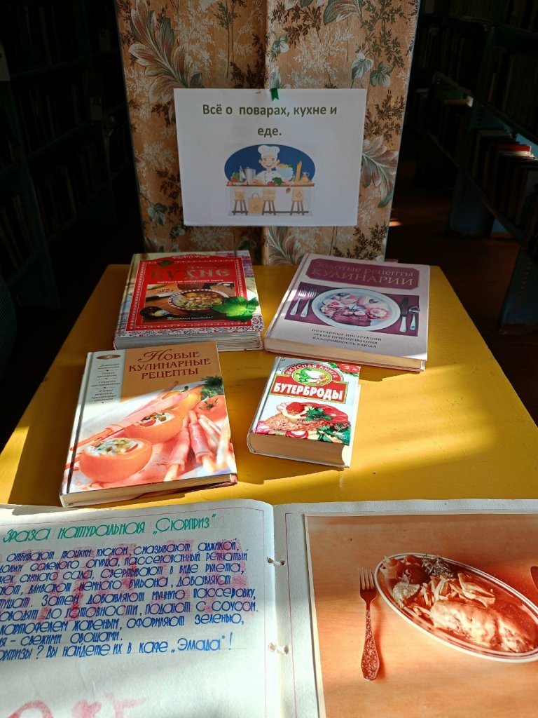 Книжная выставка «Всё о поварах, кухне и еде» в Карасинской библиотеке