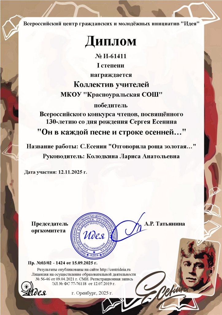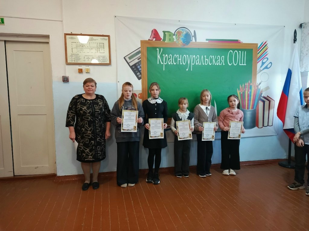 17 ноября в Красноуральской школе началось с линейки, исполнения гимна Российской Федерации и награждения обучающихся за участие во Всероссийском конкурсе чтецов, посвященного 130-летию со дня рождения С. А. Есенина.